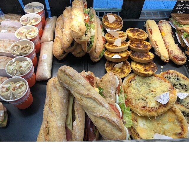 Vous y trouverez des salades composées variées, des sandwichs, paninis chauds, wraps, tartes salées, pains bagnats pour la partie salée et pour les bouches sucrées des viennoiseries, pâtisseries, beignets, crêpes, gauffres..